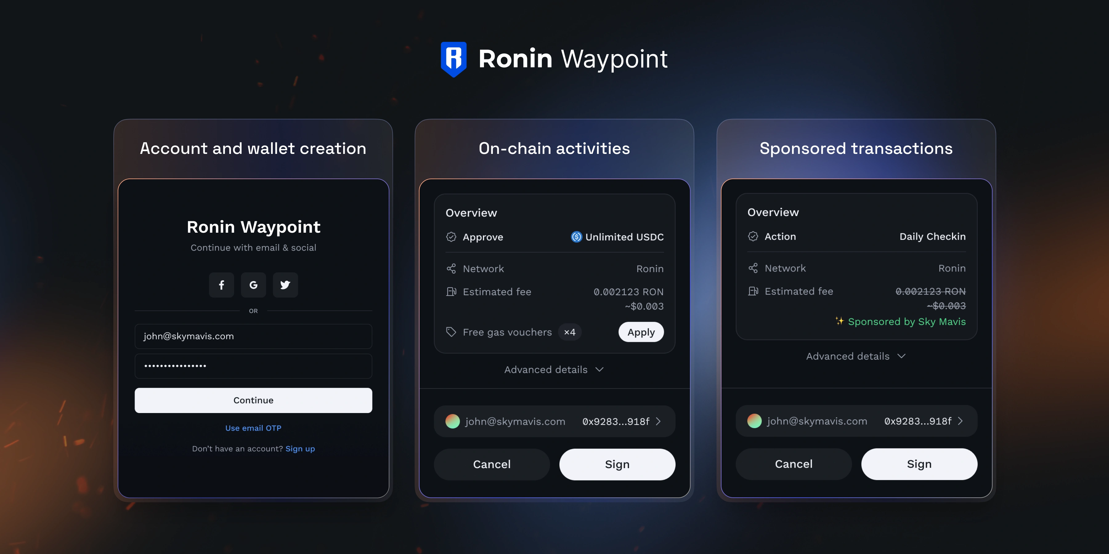 Ronin Waypoint is an account and keyless wallet in one, offering a unified gaming experience with instant onboarding, sponsored transactions, and enhanced security.